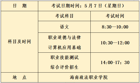 4.5月5日至7日到海南政法职业学院招生办领取《准考证》。